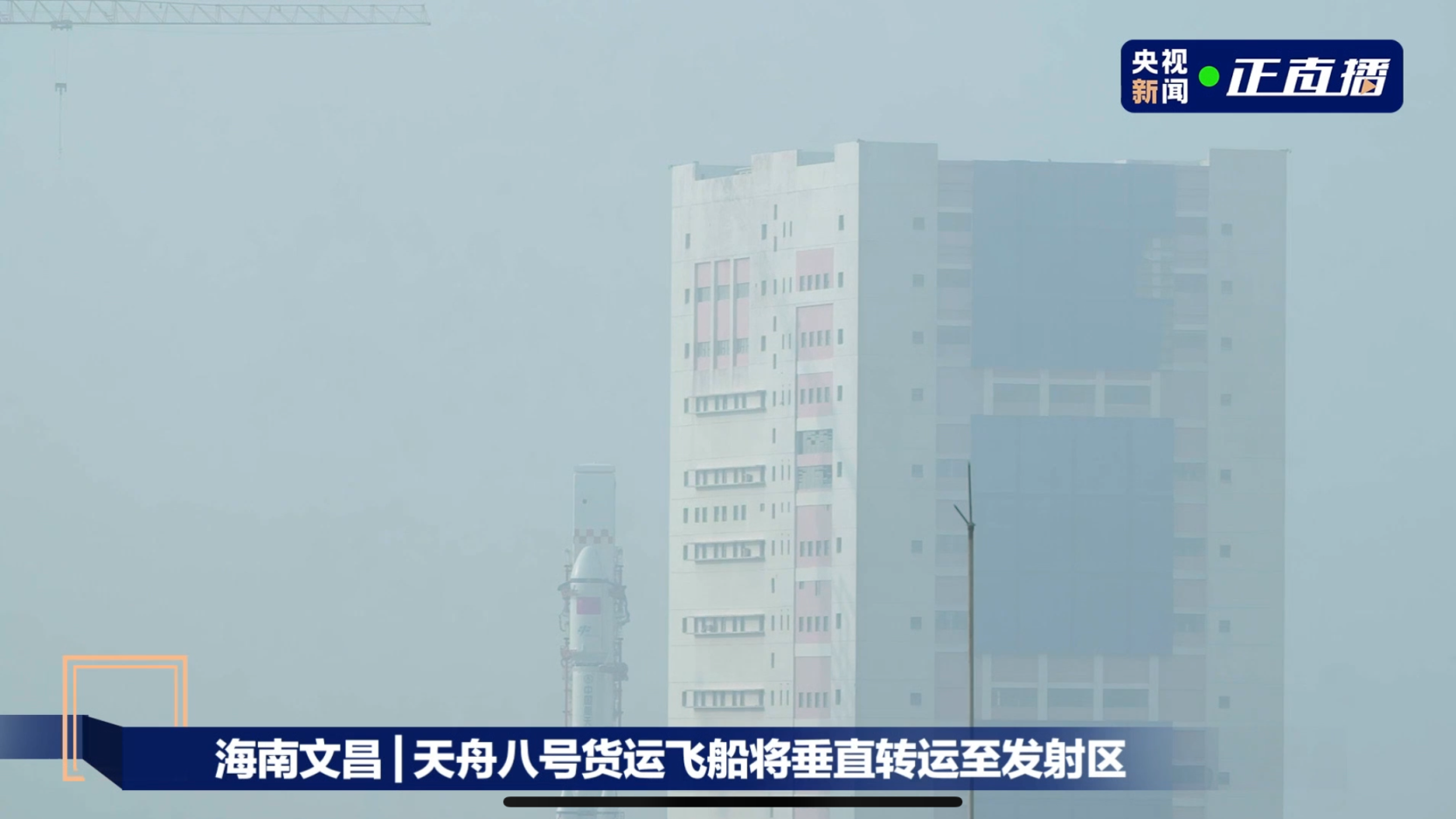 今天(13日)早上,在文昌航天辐射场,天舟八号货运飞船和长征七号遥九输送火箭组合体开动进行垂直转运。