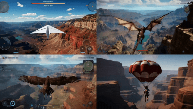 举例,底下即是盘考东谈主员向Genie 2输入Imagen 3生成的不同图像,来模拟操控纸飞机、飞龙、猎鹰或降落伞等不同的遨游形貌。