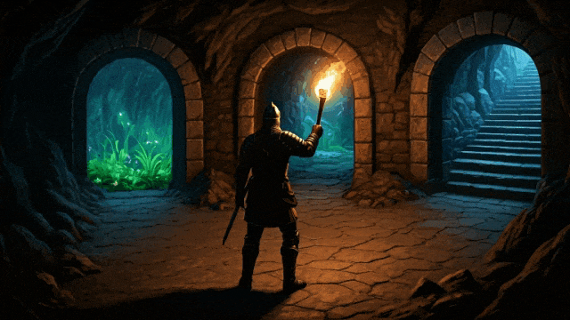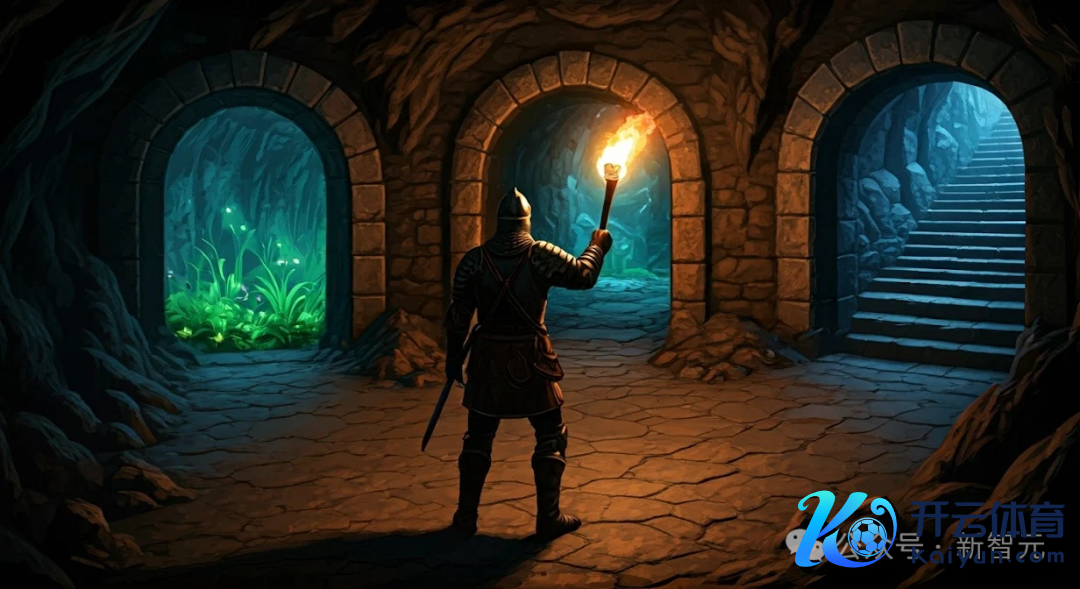 prompt:一个电脑游戏场景,展示了一座豪迈的石窍或矿洞里面。画面弃取第三东谈主称视角,镜头在主角上方俯瞰着。主角是一位手合手长剑的骑士。骑士眼前立正着三座石砌的拱门,他不错弃取插足任扫数门。透过第一扇门,不错看到无邪内滋长着舒服荧光的奇异绿色植物。第二扇门后是一条长廊,洞壁上布满了铆接的铁板,远方朦拢透出令东谈主不安的色泽。第三扇门内则是一段大意的石阶,迂曲通向未知的高处。