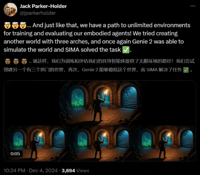 盘考者创造了一个有3个拱门的世界后,Genie 2再次模拟了这个世界,让团队管束了任务。