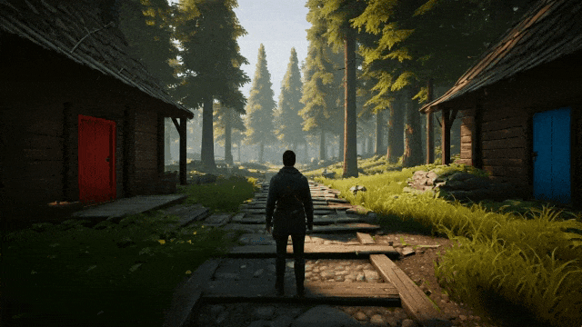 prompt:一张第三东谈主称开放世界探索游戏的截图。画面中的玩家是又名在丛林中探索的冒险者。左边有一座红门的屋子,右边有一座蓝门的屋子。镜头正对着玩家的死后。#写实格调 #推己及人
