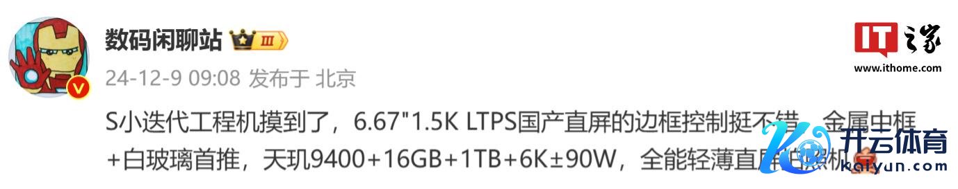 IT之家 12 月 9 日音书,博主@数码闲说念站 本日泄漏,“S 小迭代工程机”搭载 6.67\" 1.5K LTPS 国产直屏开yun体育网,“边框遗弃挺可以”。