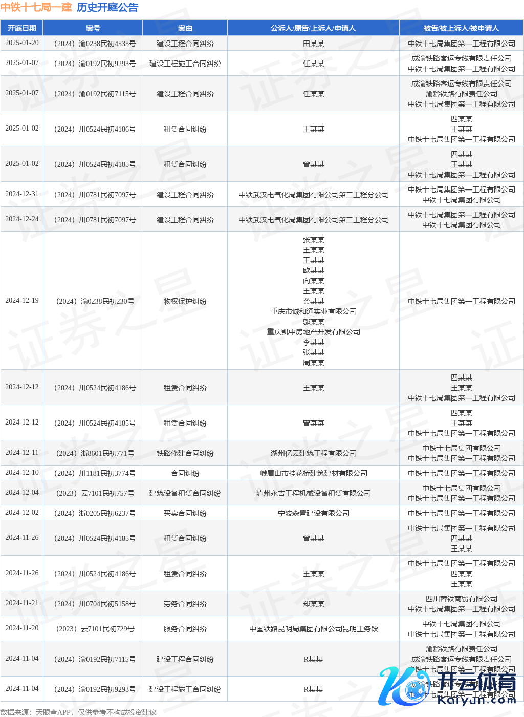 本站音书体育游戏app平台,阐发天眼查APP显现,近日公布了一则中铁十七局集团第一工程有限公司动作被告/被上诉东谈主的开庭公告,详备本体如下: