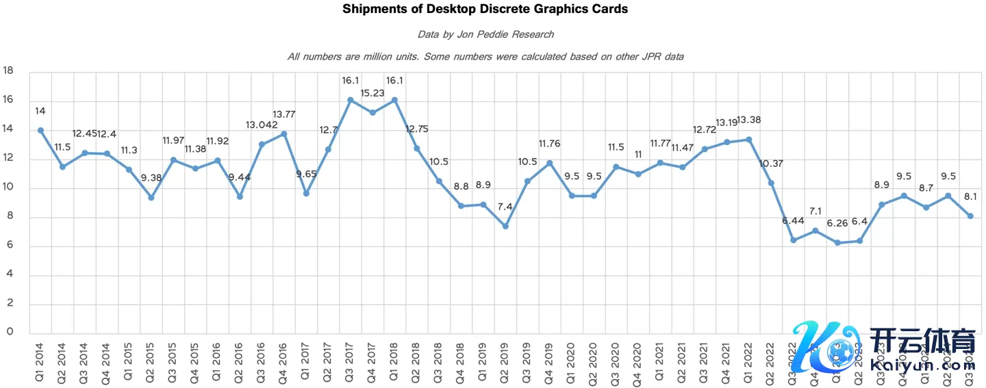 JPR 数据显现,2024 年上半年,桌面平台独显出货量为 1820 万片同比增长 46%,可是 2024 年第三季度独显出货量为 810 万片,低于 2023 年同时的 890 万片。