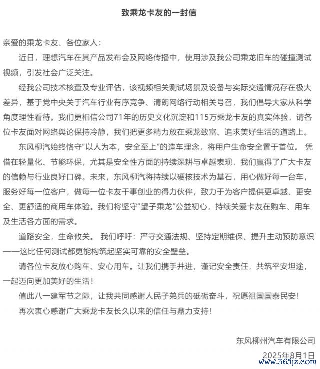 7 月 31 日晚,"乘龙卡车"微信公众号发布《东风柳州汽车有限公司对于某品牌使用碰撞视频侵权的声明》。