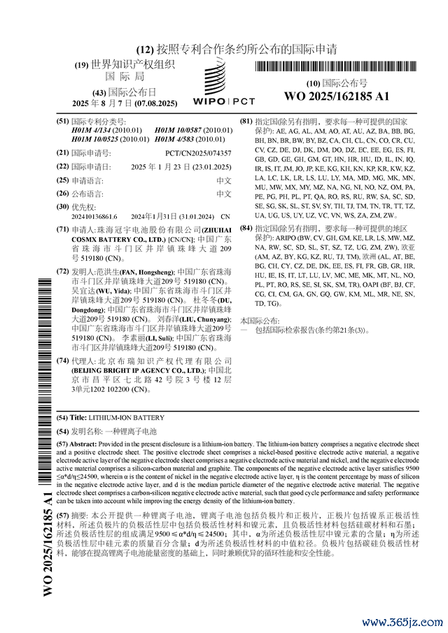 本站音书开云体育(中国)官方网站,字据企查查数据露出珠海冠宇(688772)公布了一项国外专利肯求,专利名为“一种锂离子电板”,专利肯求号为PCT/CN2025/074357,国外公布日为2025年8月7日。