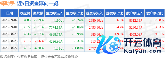 本站音讯,搁置2025年9月2日收盘,蜂助手(301382)报收于34.85元,着落5.09%体育游戏app平台,换手率7.56%,成交量13.37万手,成交额4.73亿元。