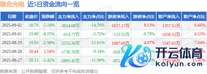 本站音书,截止2025年9月2日收盘开云体育,归拢光电(300691)报收于18.79元,下落5.1%,换手率4.88%,成交量10.77万手,成交额2.04亿元。